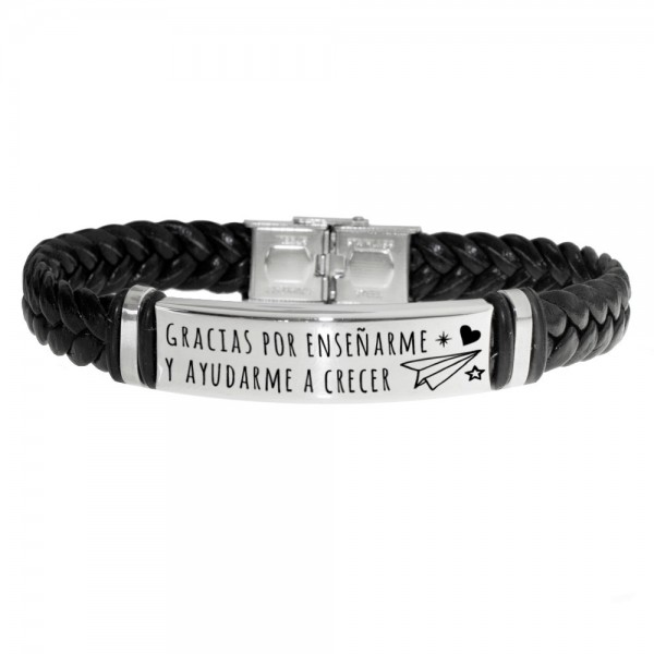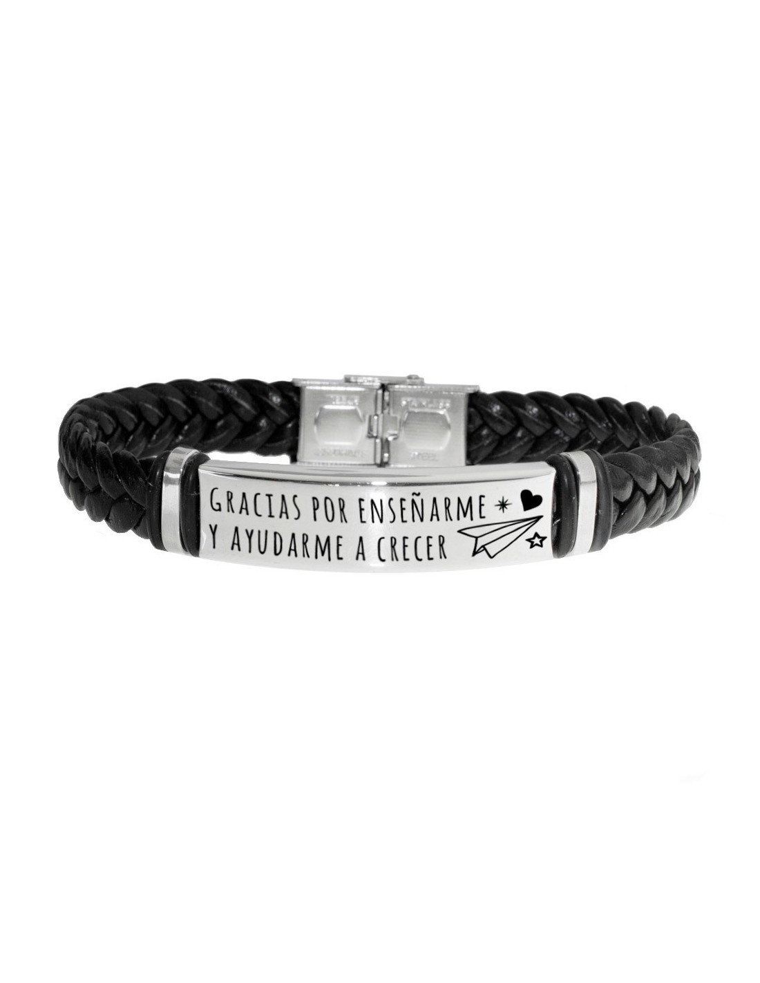 Pulsera para profesor o maestro con mensaje "Gracias por enseñarme y ayudarme a crecer" fabricada en acero inoxidable con grabado láser.