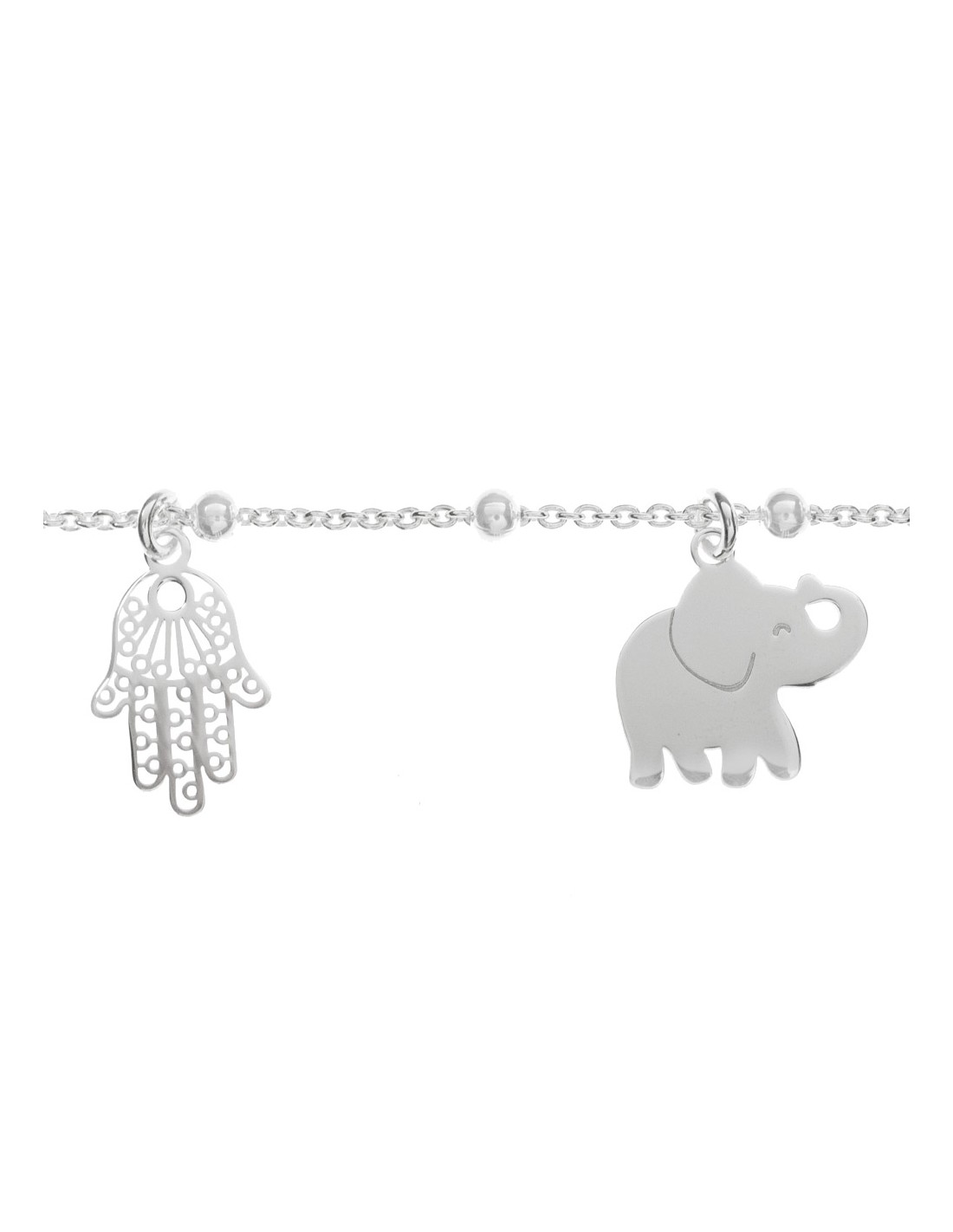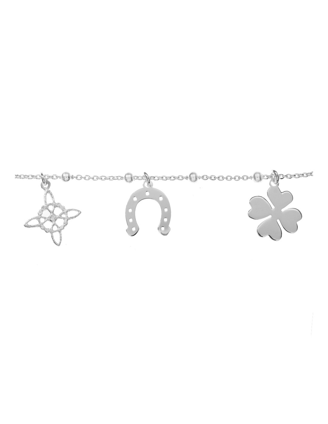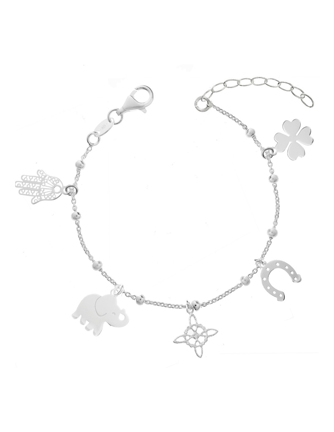 Pulsera ajustable con símbolos de la Suerte fabricada en Plata de Ley. Incluye mano de Fátima, elefante, nudo de bruja, herradura y trébol.