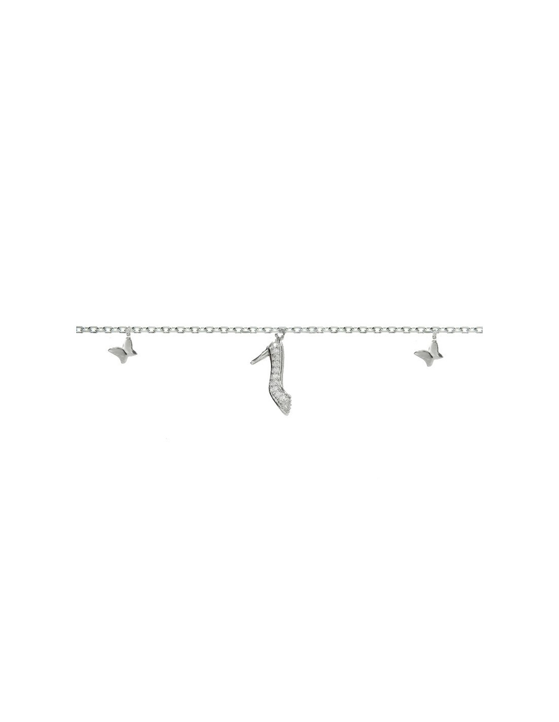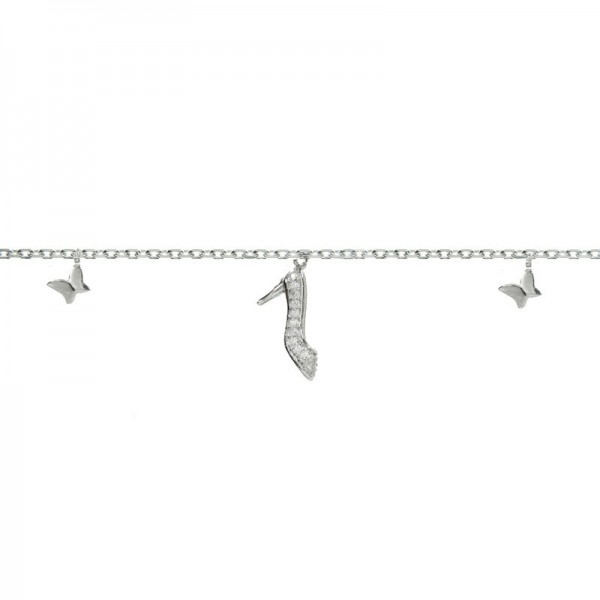 Pulsera ajustable con cinco abalorios colgantes fabricada en Plata de Ley 925 con baño de rodio. Lleva un tacón en el centro y cuatro pequeñas mariposas.