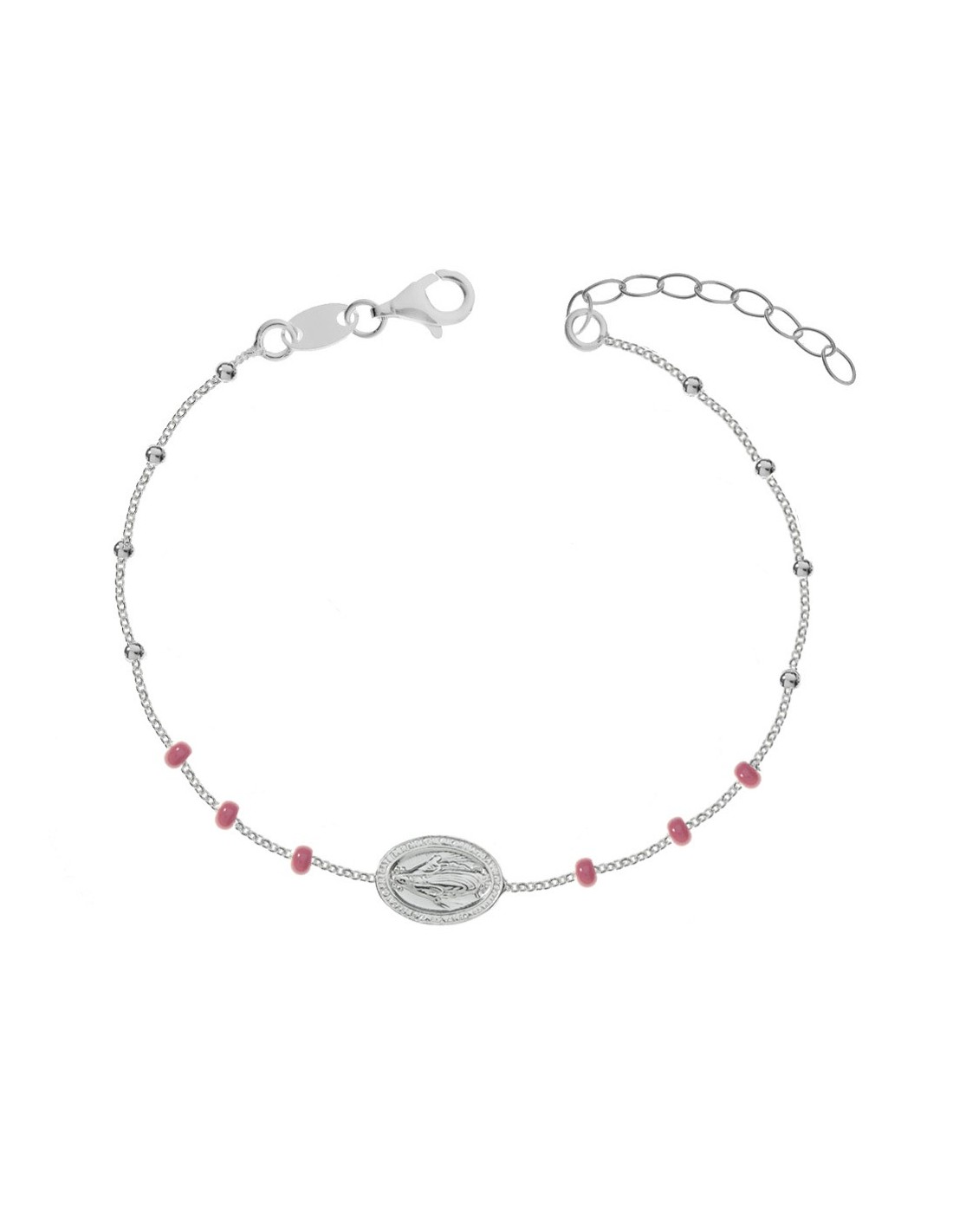 Pulsera ajustable con cadena de bolitas intercaladas y bolitas rosas con virgen de la Milagrosa fabricada en Plata de Ley