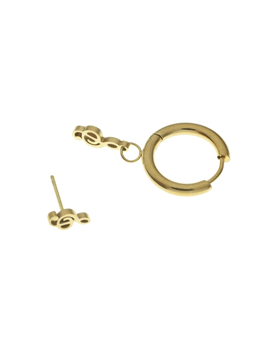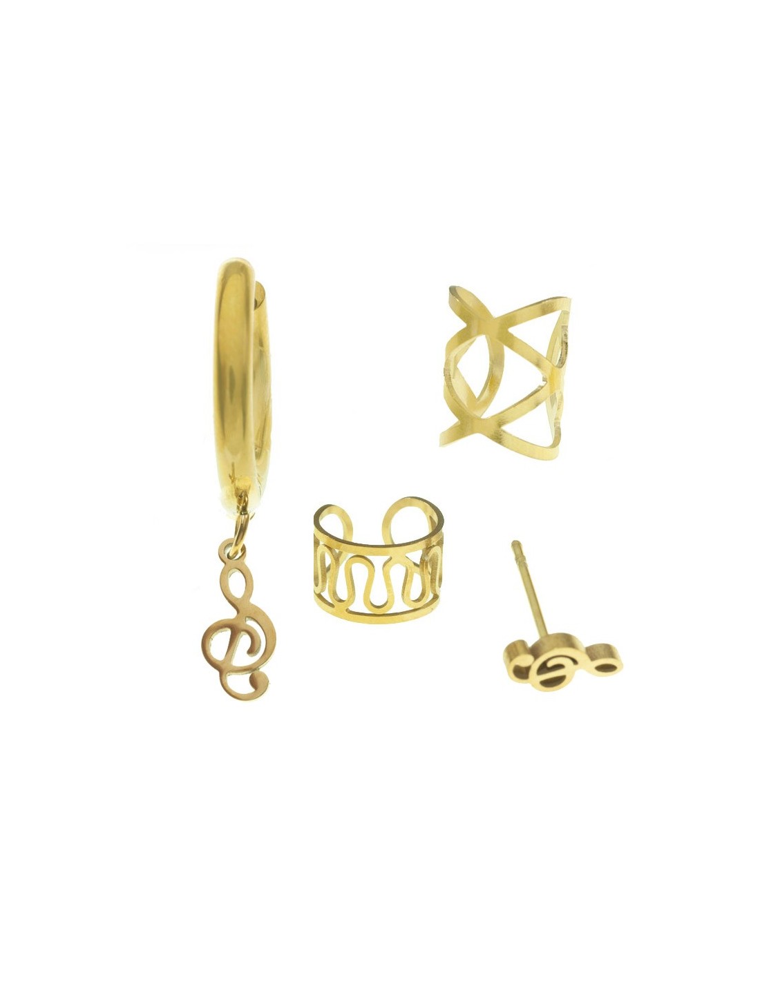 Set de pendientes con aro clave de Sol fabricados en acero dorado. Incluye aro con clave de Sol, dos ear cuff para cartílago y un pendiente clave de Sol.