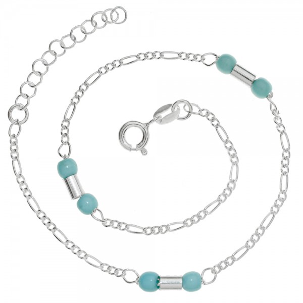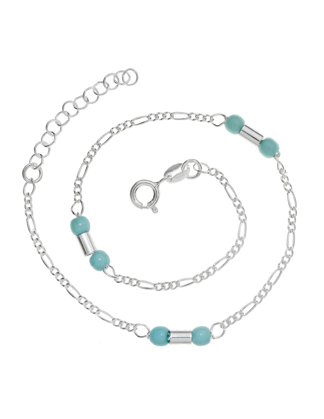 Tobillera ajustable cadena eslabón 3x1 con tubos y bolitas color azul fabricada en Plata de Ley 925